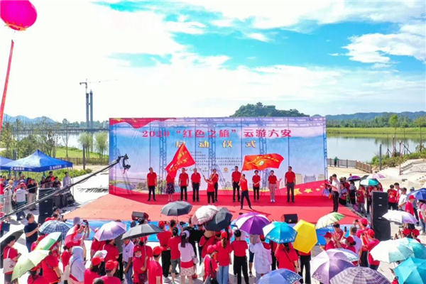 开幕式现场市领导王岚和王安义分别为六安抗疫医护人员“皖美”之旅和“2020六安红色徒步之旅”的代表们授旗。