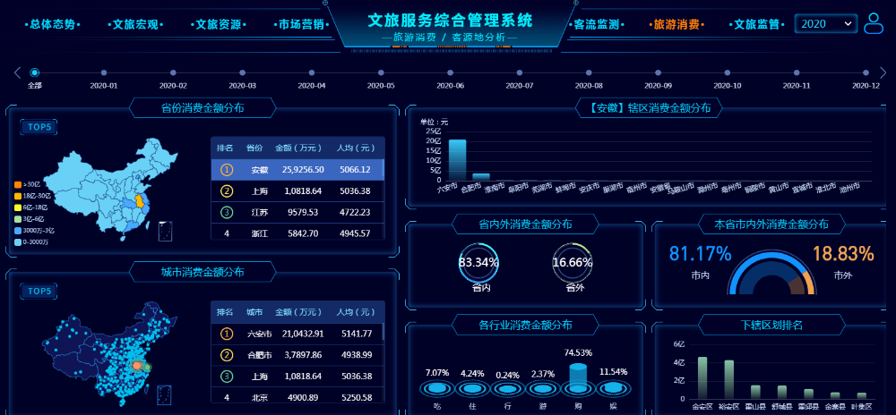 六安文旅服务综合管理系统将文旅、公安、发改以及互联网、OTA、运营商、银联等渠道的多元化数据进行集合、整合和利用,目前共文旅政策、文旅经济、文旅投资、文旅资源、市场营销、客流监测、旅游消费、文旅监管八个模块,设计800个指标,汇聚6万余条数据,形成220张数据表。
