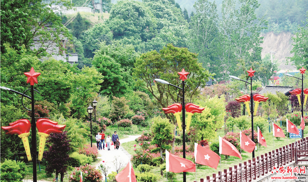 图为5月3日,游客在绿树成荫的红军街休闲广场上观景。(皖西日报融媒体记者 陈力 摄)