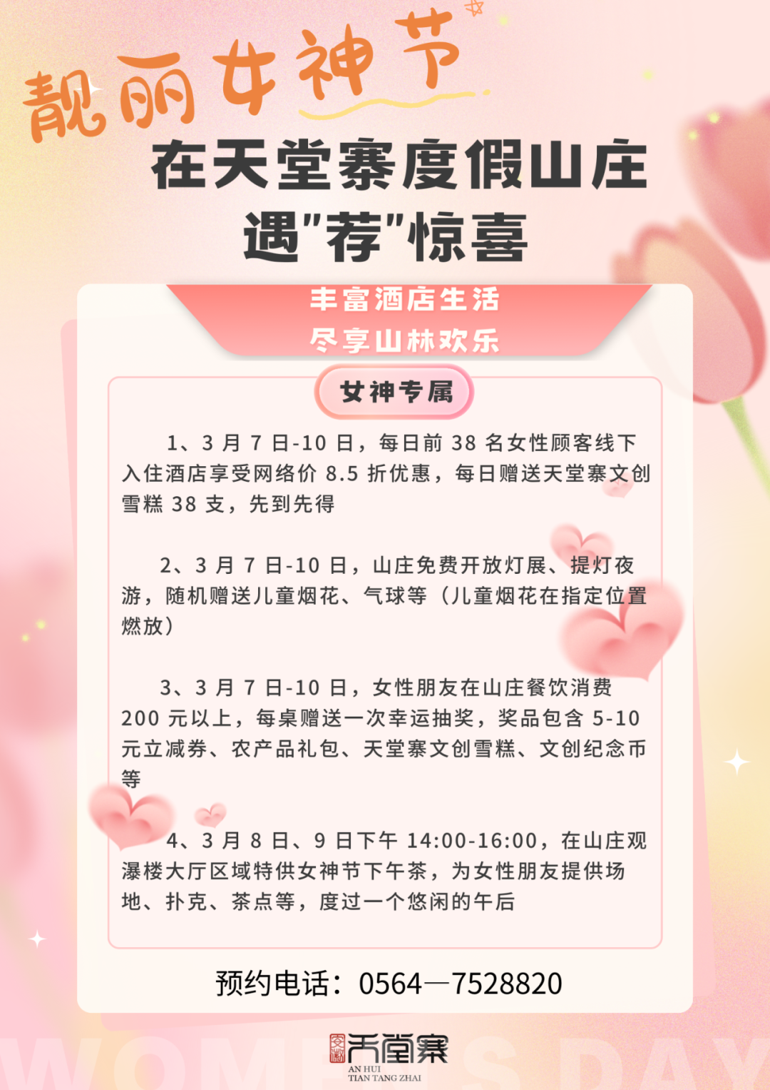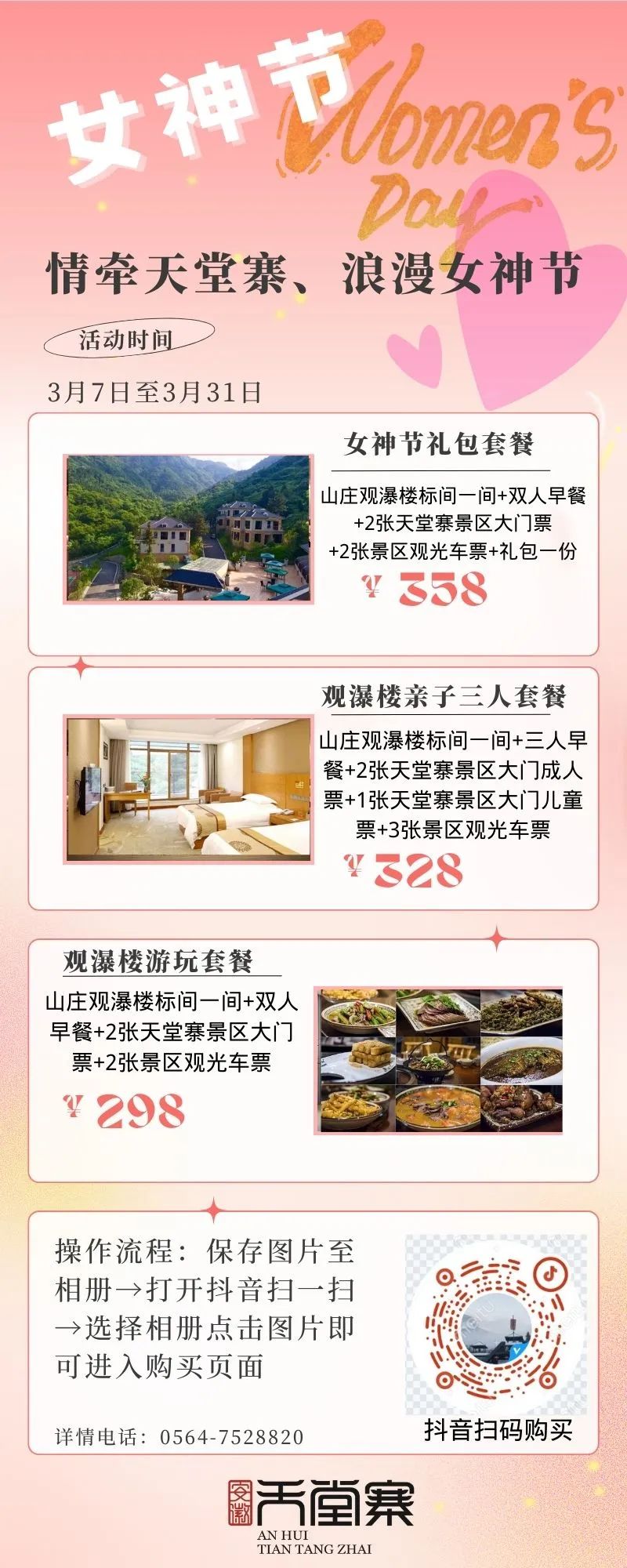 春暖女神季,惠游天堂寨 编辑:汤晓雪 来源:天堂寨景区 浏览次数: 次 发布时间:2024-03-07 16:17:54 【字体:小 大】 03.08GODDESS'SDAYLIVE UP TO THE GLORY OF YOUTHGODDESS'S DAY女神“价”临,男神“价”到三八女神节天堂寨景区准备了一份“厚礼”献给值得被宠爱的你赶紧来签收一下致最美的你3月7日至3月10日天堂寨景区对所有女性游客免门票愿岁月精致我们都能活成女神天堂寨的诗意画卷正在徐徐展开满山风情,从未媚俗一山生灵,繁衍不息愿每一位披荆斩棘的女神都能在天堂寨收获无限的爱与幸运唯有大自然给的“惊喜”才能配得上每一位独一无二的女神天堂寨景区愿您:历尽山河,觉得人间值得阳春三月天堂寨景区也给合肥市民送来了福利优惠内容:合肥籍居民(凭身份证)、长期居住合肥市居民(凭居住证或至少连续1年以上缴纳社保流水证明)、在合肥市就读学生(凭学生证)享受景区门票半价优惠50元/人。3·8妇女节三月的春风暖阳唯美了天堂寨的碧空云海吹绿了天堂寨的摇曳生姿迸发了天堂寨的朝气蓬勃登高、踏春、赏景才是女神节的正确打开方式天堂寨景区诚意满满,恭迎各路女神驾到 扫一扫在手机打开当前页 【打印正文】 上一篇:春回大别山,邀您来赏花~ [ 2024-03-06 ] 下一篇:“春游江淮 请来六安” 六安向您发出春天的邀请函 [ 2024-03-08 ]
