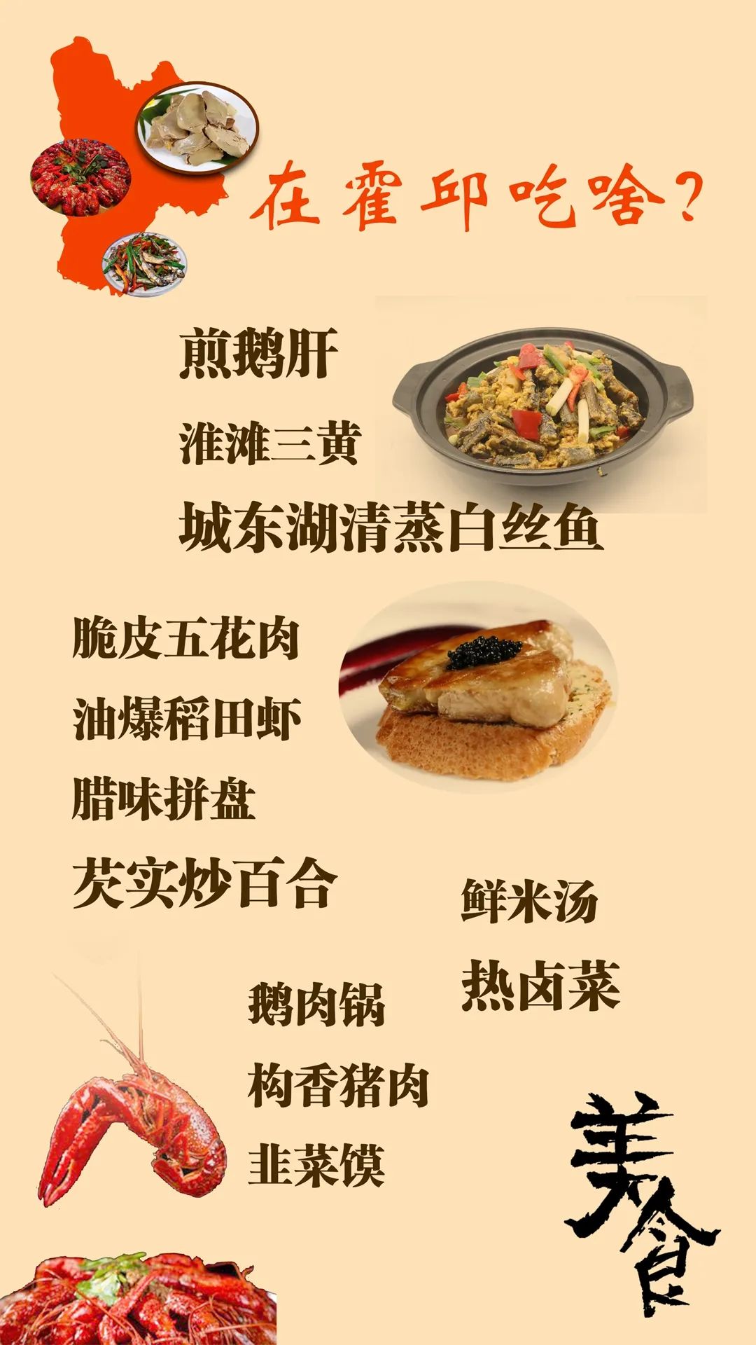 今夏当季的美食小龙虾产地就在这里,火出国的法式鹅肝也在这里,还有对水质要求极高的白丝鱼、香甜的芡实和鲜味十足的淮滩三黄都在等着你来细品。