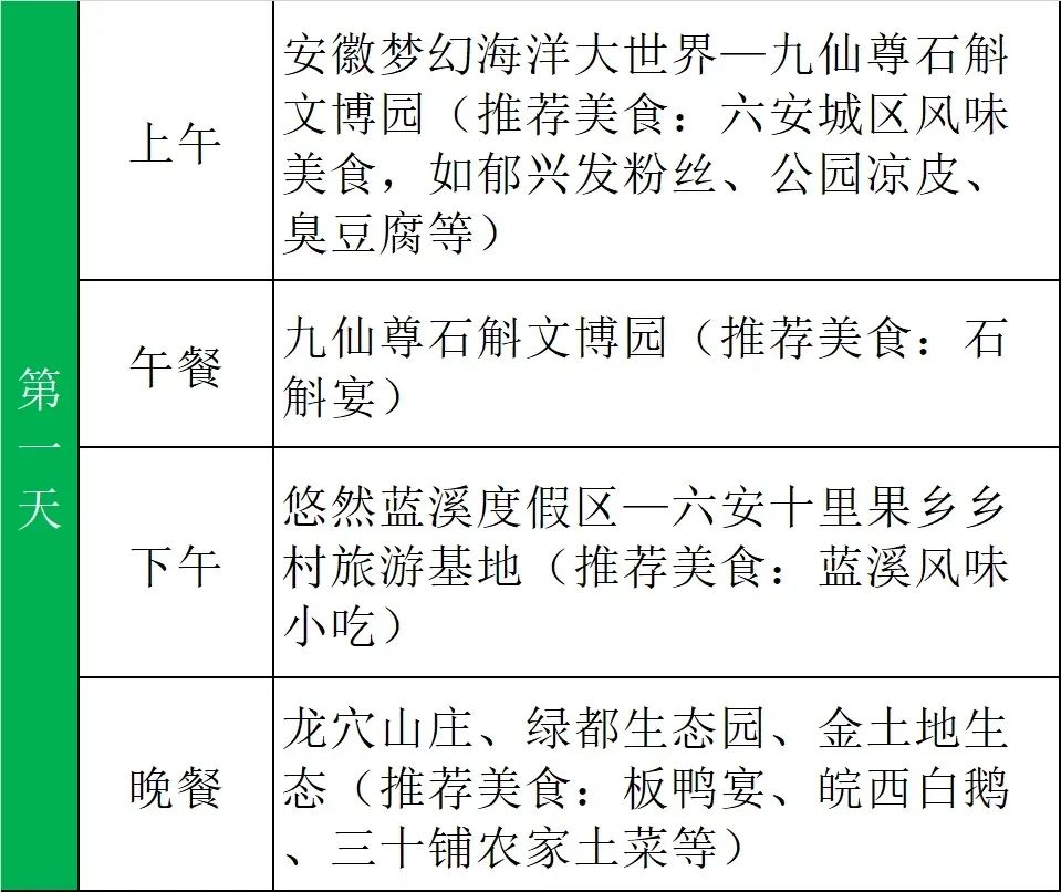 线路:安徽梦幻海洋大世界——九仙尊石斛文博园——悠然蓝溪度假区——六安十里果乡乡村旅游基地(绿都生态园、金土地生态园、欣沃生态园)