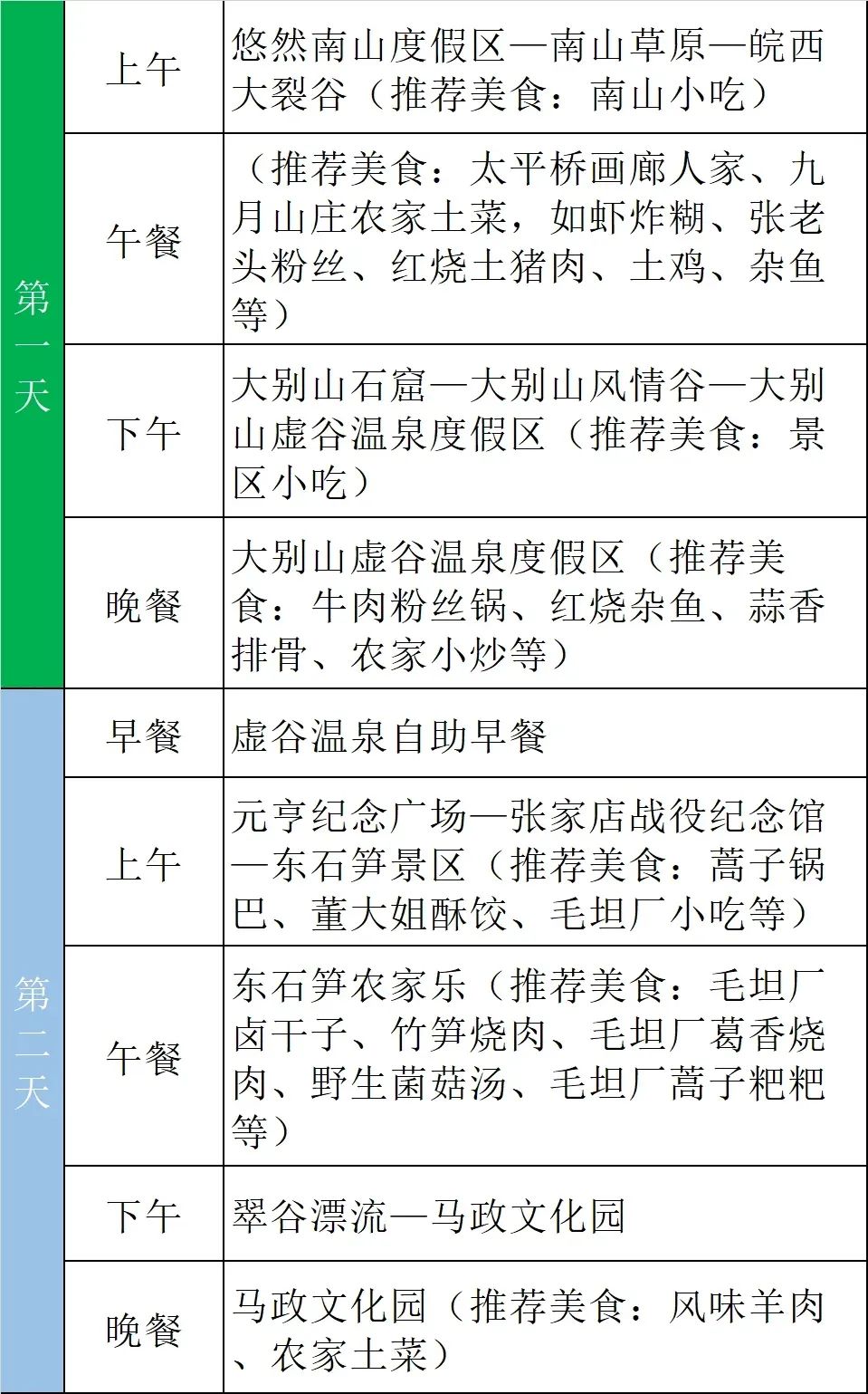 线路:悠然南山度假区——南山草原——皖西大裂谷——太平桥画廊人家——大别山石窟——大别山风情谷——大别山虚谷温泉度假区——毛坦厂古镇(马政文化园、东石笋、张家店战斗纪念馆、翠谷漂流)