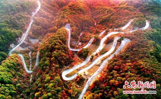 蜿蜒在在漫山的红叶中的山区公路,像是镶嵌在群山里的九曲黄河。(无人机拍摄)