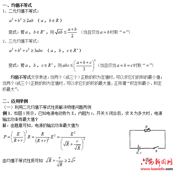 【关键词】 均值不等式 极值 物理问题 定积求和 定和求积