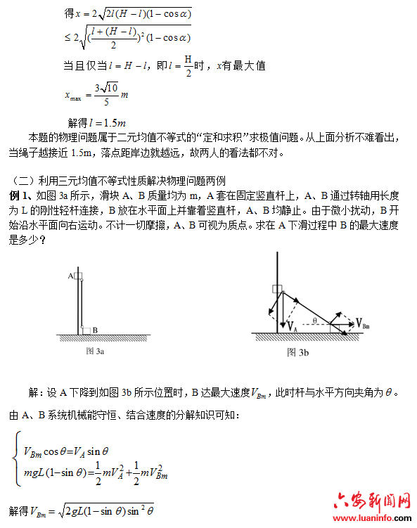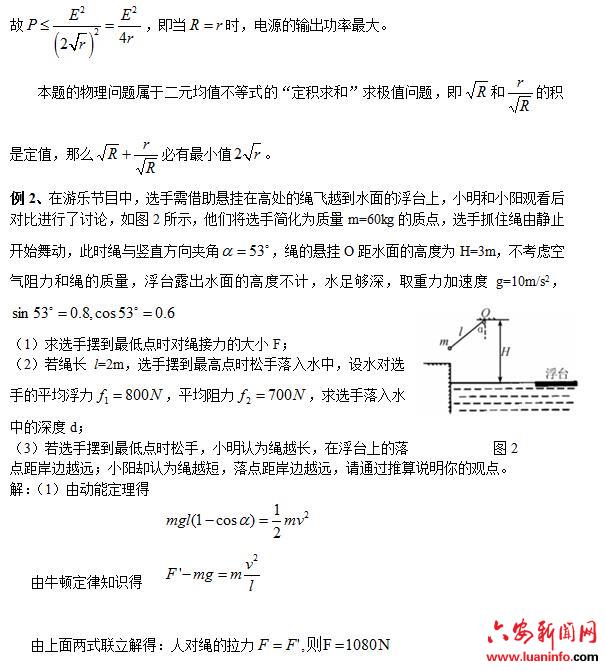 【摘要】 高考《考试说明》中对学生的能力要求有五个方面,其中第四个能力即为应用数学处理物理问题的能力。物理学是一门精密科学,与数学有着密切的关系,离开了数学就无法真正应用物理知识解决实际问题,因此,高考物理对此能力考察的频率非常高。本文以利用均值不等式求极值的方法,再谈数学在解决物理问题中的应用,以加深理解,高效备考。