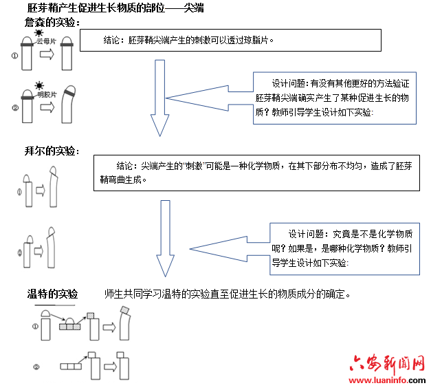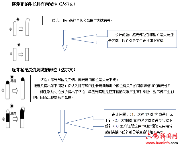 以此引入“生长素的发现过程”的教学,师生共同完成达尔文有关胚芽鞘的生长具有向光性的实验设计。