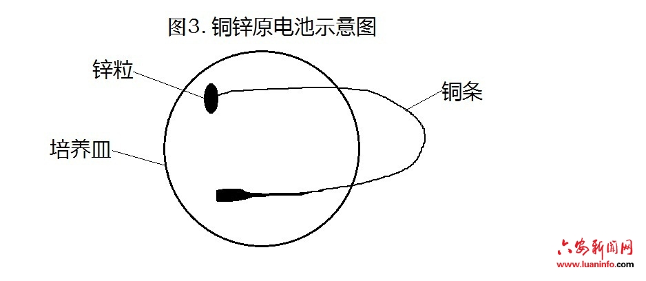 教师先取一个培养皿放在多媒体实物展台上,再向培养皿中放入一粒锌粒,然后取一根事先弯成U形的铜条,将铜条一端搭在锌粒上,另一端用锤子击打成薄片后搭在培养皿内,铜条的中间部分搭在培养皿外,然后向培养皿中加入蒸馏水以浸没铜条的两端为宜。如图3所示