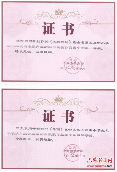 为促进全市中小学艺术教育,推动学校美育改革发展,全面提高学生素质,根据安徽省教育厅部署和《六安市第五届中小学生艺术展演活动实施方案》要求,我市于2014年12月至2015年6月组织了“阳光下成长”艺术展演活动,我校师生在全省展演市级评选活动中成绩突出,邵弈帅同学创作的《水粉静物》荣获作品类中学组一等奖,汪文东同学创作的《绘画》荣获作品类中学组二等奖,陈今翌老师荣获优秀指导老师奖。