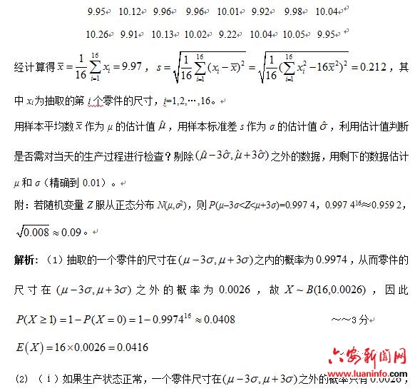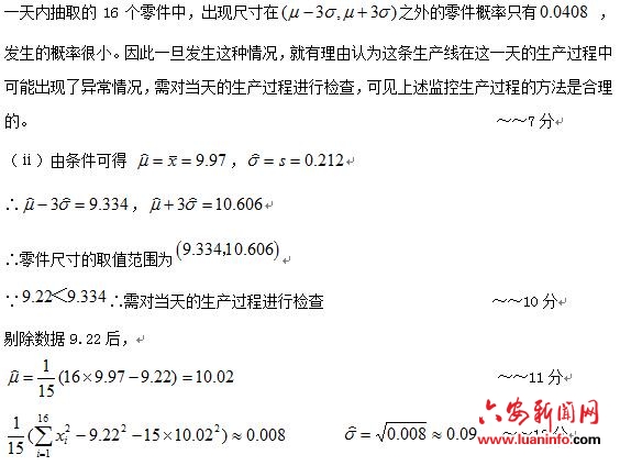 (2)一天内抽检零件中,如果出现了尺寸在(μ-3σ,μ+3σ)之外的零件,就认为这条生产线在这一天的生产过程可能出现了异常情况,需对当天的生产过程进行检查。