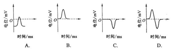 解析:施加适宜的刺激,神经细胞产生兴奋。将电极均置于膜外,当兴奋传至左电极接触点时,其发生一次电位变化,而右电极接触点电位未变化,表现为正电位,这时电流会从右电极流向左电极;当兴奋传至右电极接触点时,其也发生一次电位变化,而左电极接触点已恢复为正电位,这时电流会从左电极流向右电极。当两电极接触点发生电位变化时,两极之间电位差的绝对值会先增大再减小,表现为波形曲线,而兴奋先后通过两电极接触点时,电流方向相反,反映两极电位变化相对值的波形曲线则分布在横轴上下两侧,故答案选D。