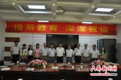 在皖西中学,孙云飞一行认真听取了我校校长、党委书记、皖西中学董事长许秀旗和副校长、皖西中学校长王建安关于学校工作的设想、计划、定位等情况的汇报。孙云飞对皖西中学近年来的发展表示高度肯定,并强调要感谢老师,看重老师,善待老师,当好老师,充分发挥好广大教师在学校教育工作的重要价值。