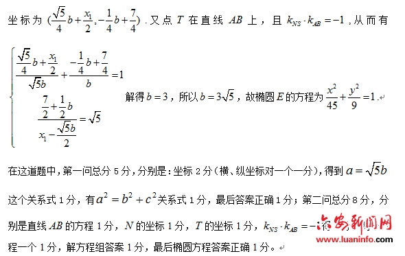 5.答案重于过程。这就要求我们的学生计算能力一定要加强,结果正确非常重要。比如20题如果第一问的结果正确,写了坐标,基本就是5分,即使没有a2=b2+c2这个关系式也不扣分。第二问如果结果正确,只写了两个方程组也是可以的。所以说如果答案正确,有些步骤没写是可以忽略不计的。