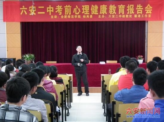 4月23日下午,六安二中举办考前心理健康教育报告会,合肥师范大学杨再勇老师从身体健康、科学复习、心理稳定和沉着应考等四个方面给全体高三同学进行了心理辅导培训,深受广大师生的欢迎。