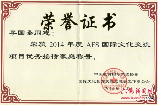 2014年11月12-15日, CEAIE-AFS国际文化交流项目全国年度工作会议暨国际文化教育交流志愿者工作委员会会员代表大会在广州召开。我校国际交流与特色教育部主任陈刚出席会议,我校接待家庭李国圣家庭荣获2014年度AFS项目优秀接待家庭并参加颁奖典礼。李国圣家庭于2013年8月至2014年6月接待美国留学生Chlsea Alysha BeGole 来家庭生活十个月。我校国际文化教育交流志愿者项目开始于2013年,第一年接待了3位留学生,分别来自美国、巴西和泰国。2014年,我校又接待了2位分别来自德国和意大利的留学生,面向社会公正、择优选择了接待家庭,并始终保持密切联系,家校配合共同做好留学生的接待和培养工作。