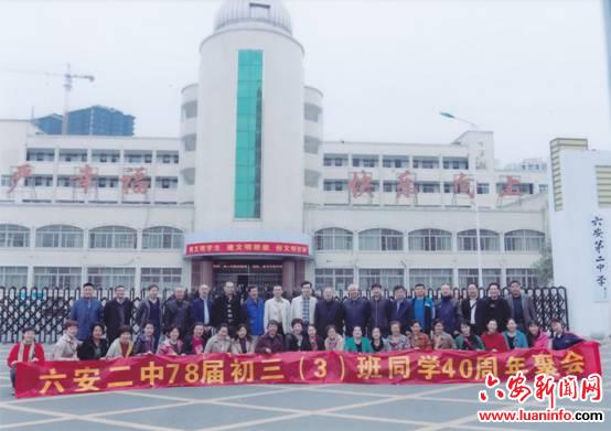 今年是我国改革开放四十周年。10月20日、21日两天,六安二中1978届初三(3)班同学回母校举行了毕业40周年聚会。他们怀着对母校十分崇敬的心情参观了二中校园,尤其是耳闻目睹了改革开放四十年来学校的巨大变化,感慨万千。图为该班同学在母校大门前合影。(后排左起第十位、第十一位分别为先后担任该班班主任的刘德传和吴长生两位老师。)