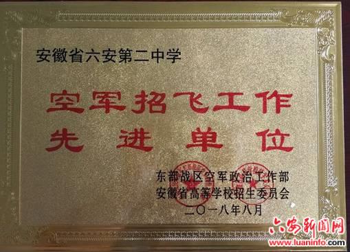 近日,六安二中再次喜获东部战区空军政治工作部和安徽省高等学校招生委员会联合颁发的“空军招飞工作先进单位”荣誉奖牌。