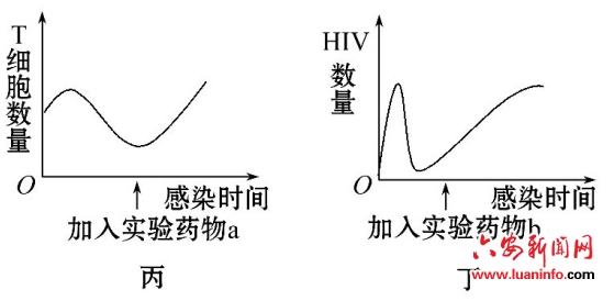 再如在新课标全国卷Ⅰ第4题中考查了关于HIV病毒动物实验的内容,难点在据图分析HIV可能对实验药物a敏感还是对实验药物b敏感。仔细研读教材后大家会发现,图例丙、丁是根据教材P36《资料分析》中的图改编来的,进一步研读教材,我们需要对HIV浓度和T细胞数量变化的各段发生的原因进行研究,如分析HIV数量在第1年出现迅速下降的原因是机体免疫系统清除了大多数的病毒。我们不妨设想在2014年的高考中会不会也出现这样根据教材内容改编的试题呢?