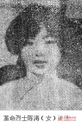 陈涛(1920-1941),女,原名余素芳,字冰梅。民国9年(1920)生于安徽省霍丘县一个贫农家度,姐弟5人,她排行第二,自幼聪慧伶俐,因家庭贫困,只给她一人上学。14岁时,由于她成绩优异,考入陆耿女子中学。一次,放学途中,见一女孩落水,她和同学刘斌下河奋力抢救,使女孩脱险。